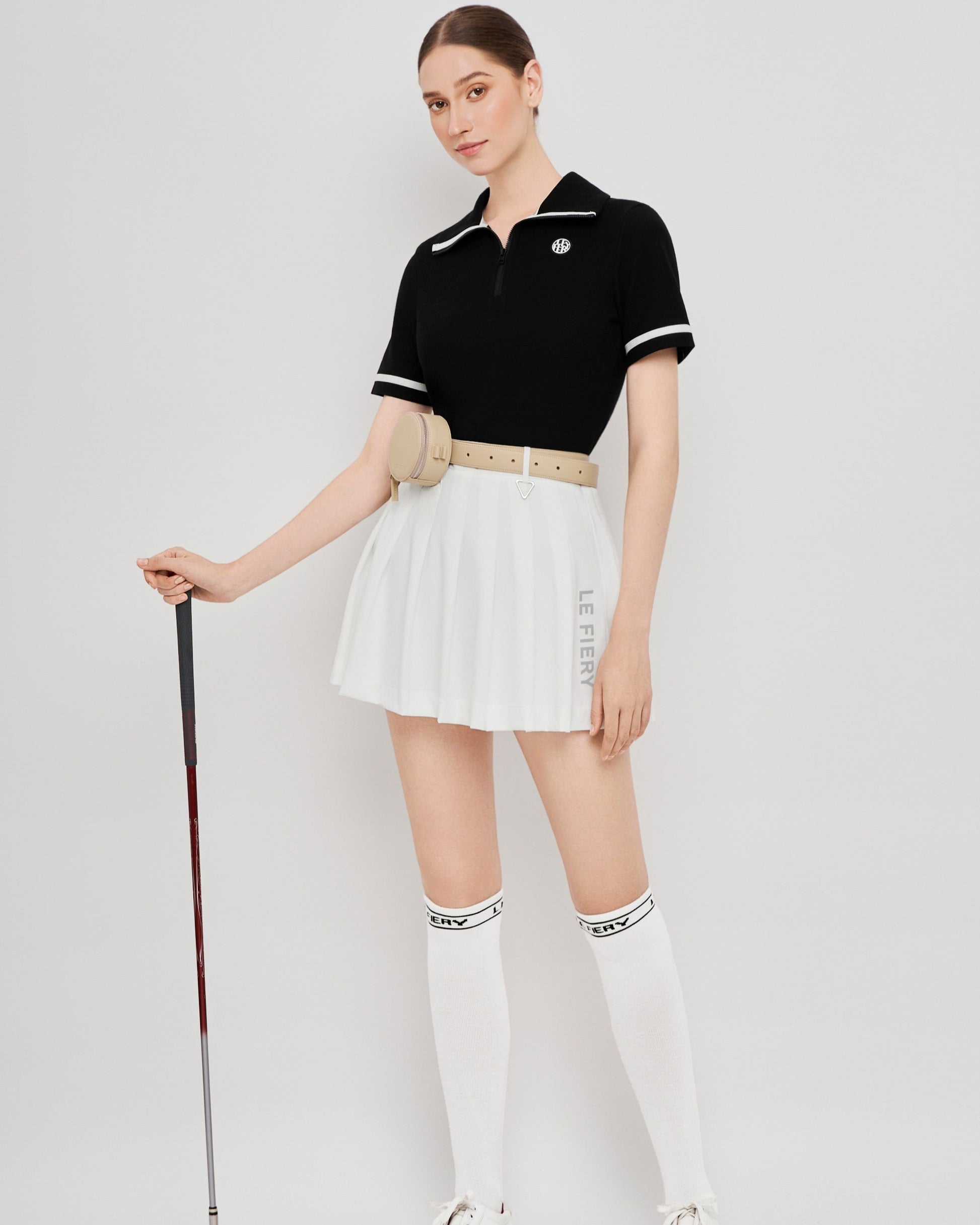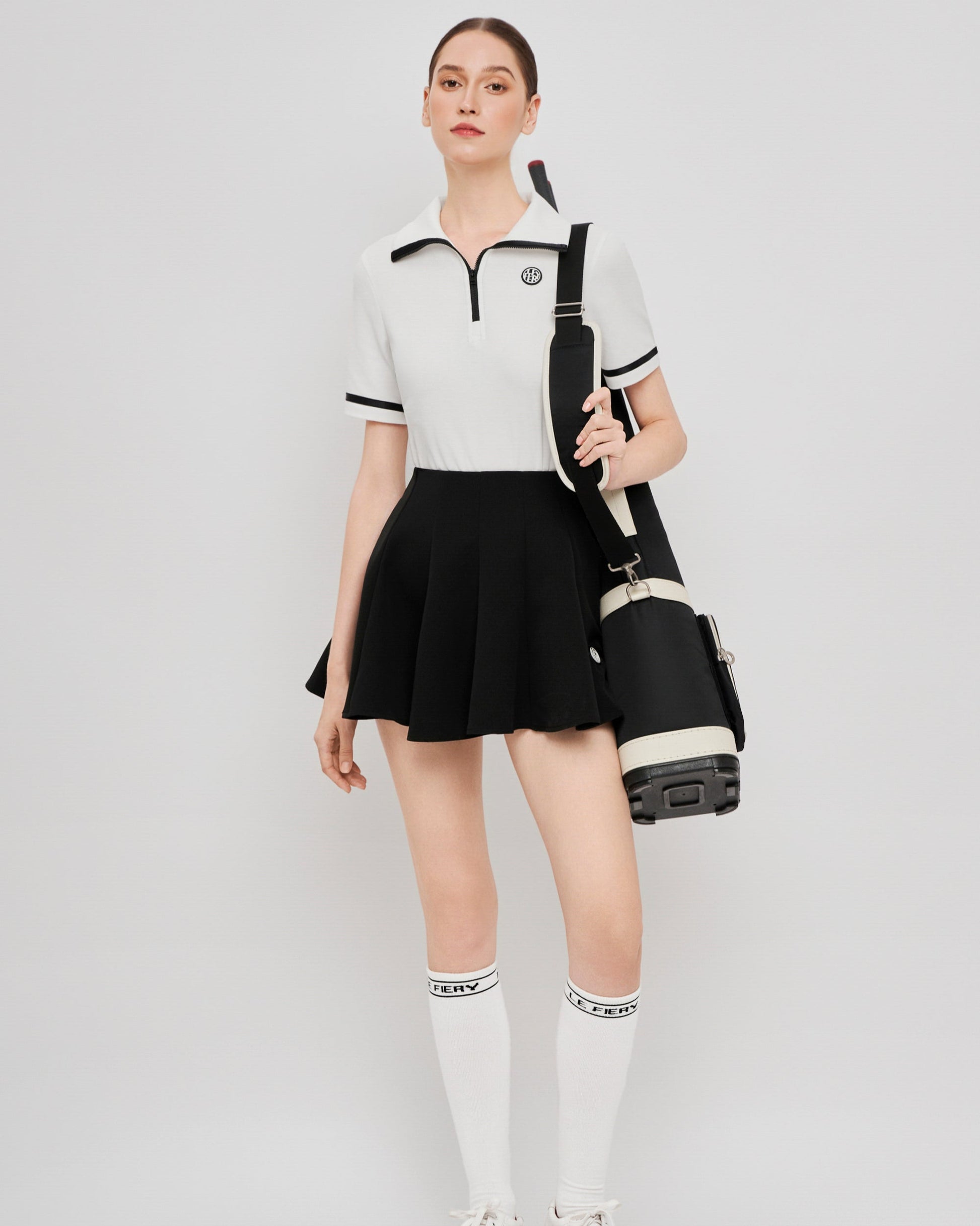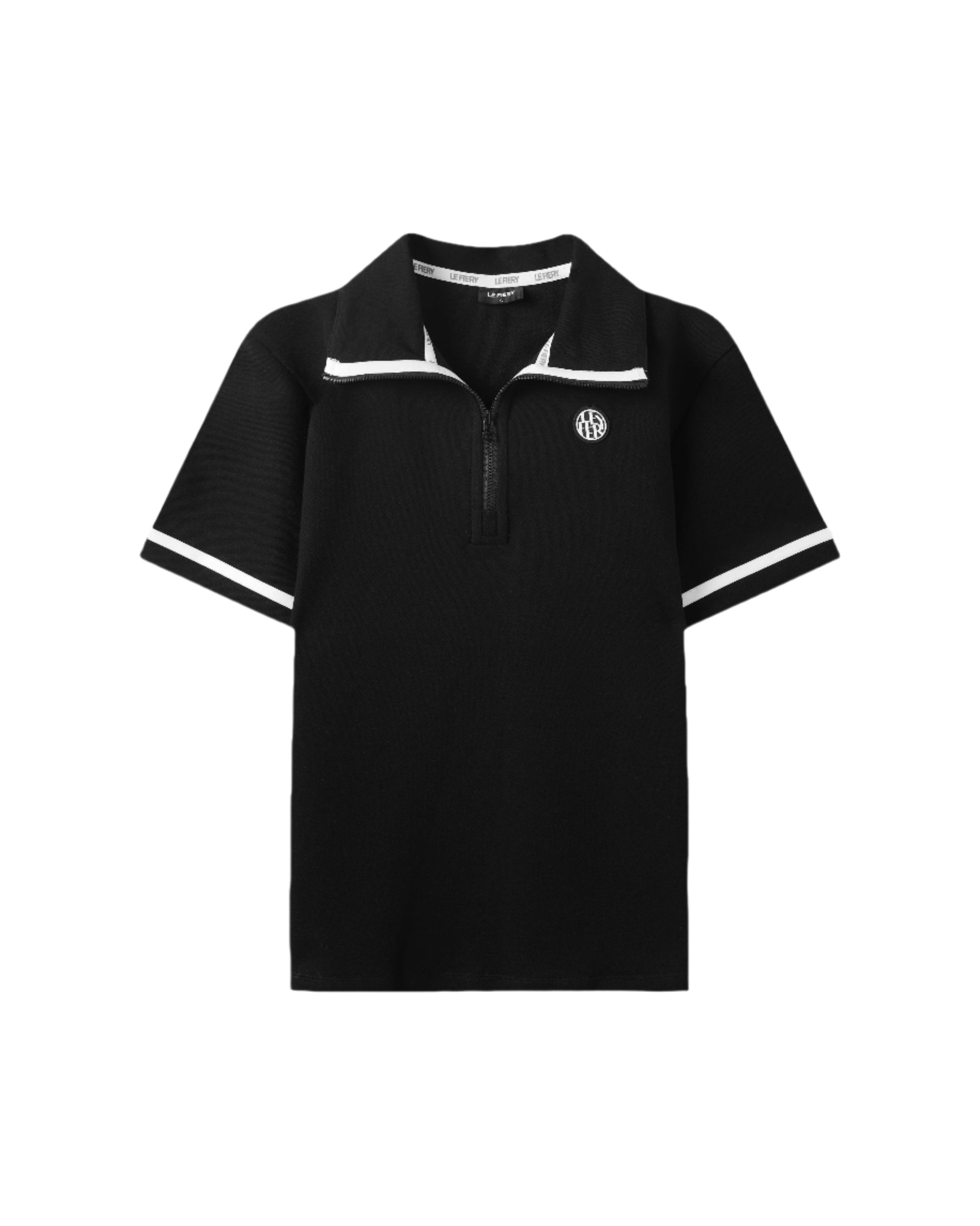 Short-sleeve polo shirt with zipper collar and sporty sleeve trim, made from breathable elastic fabric. Ideal for sports like tennis, golf, or daily activewear. Available in three colors: Black, Navy, and White.