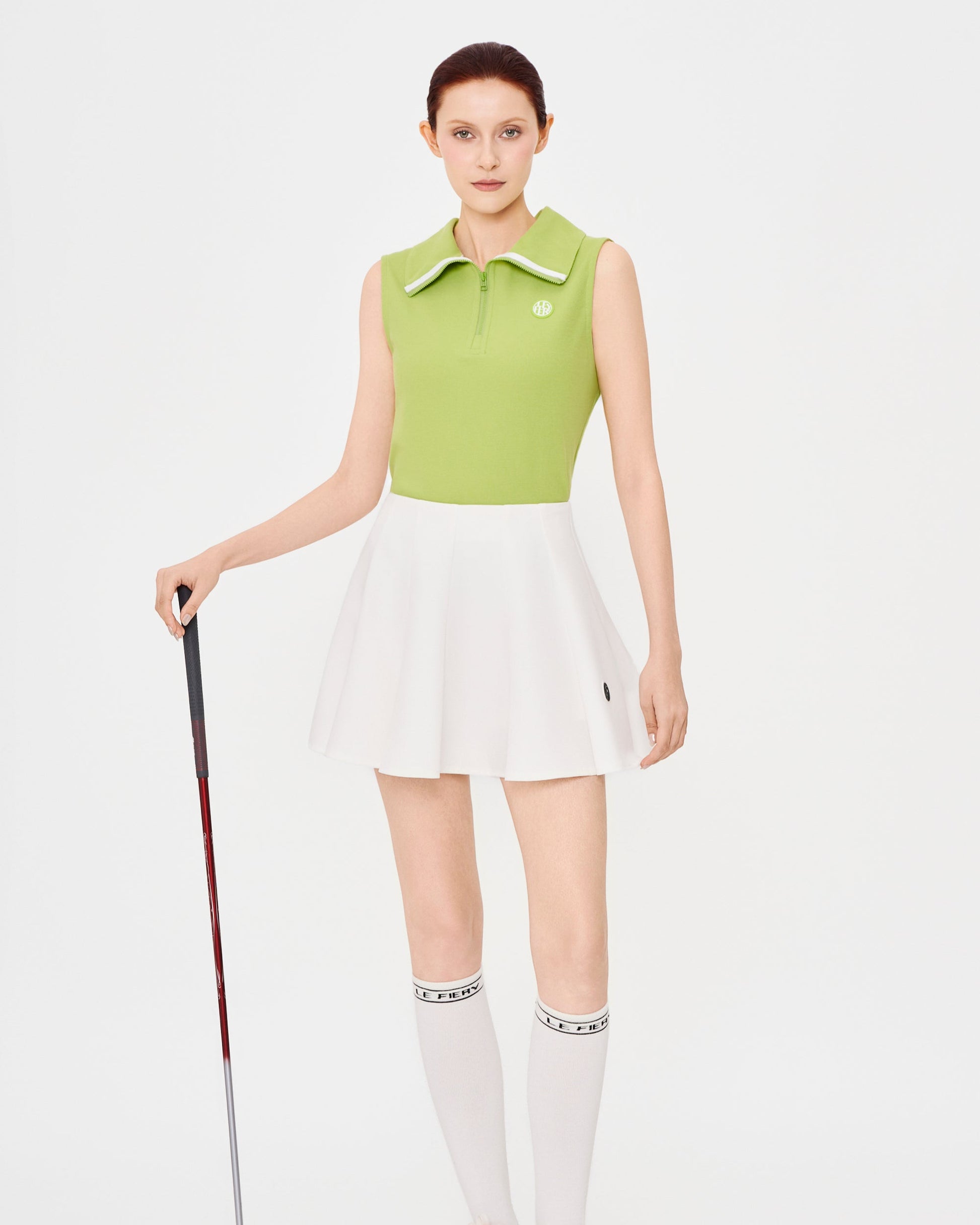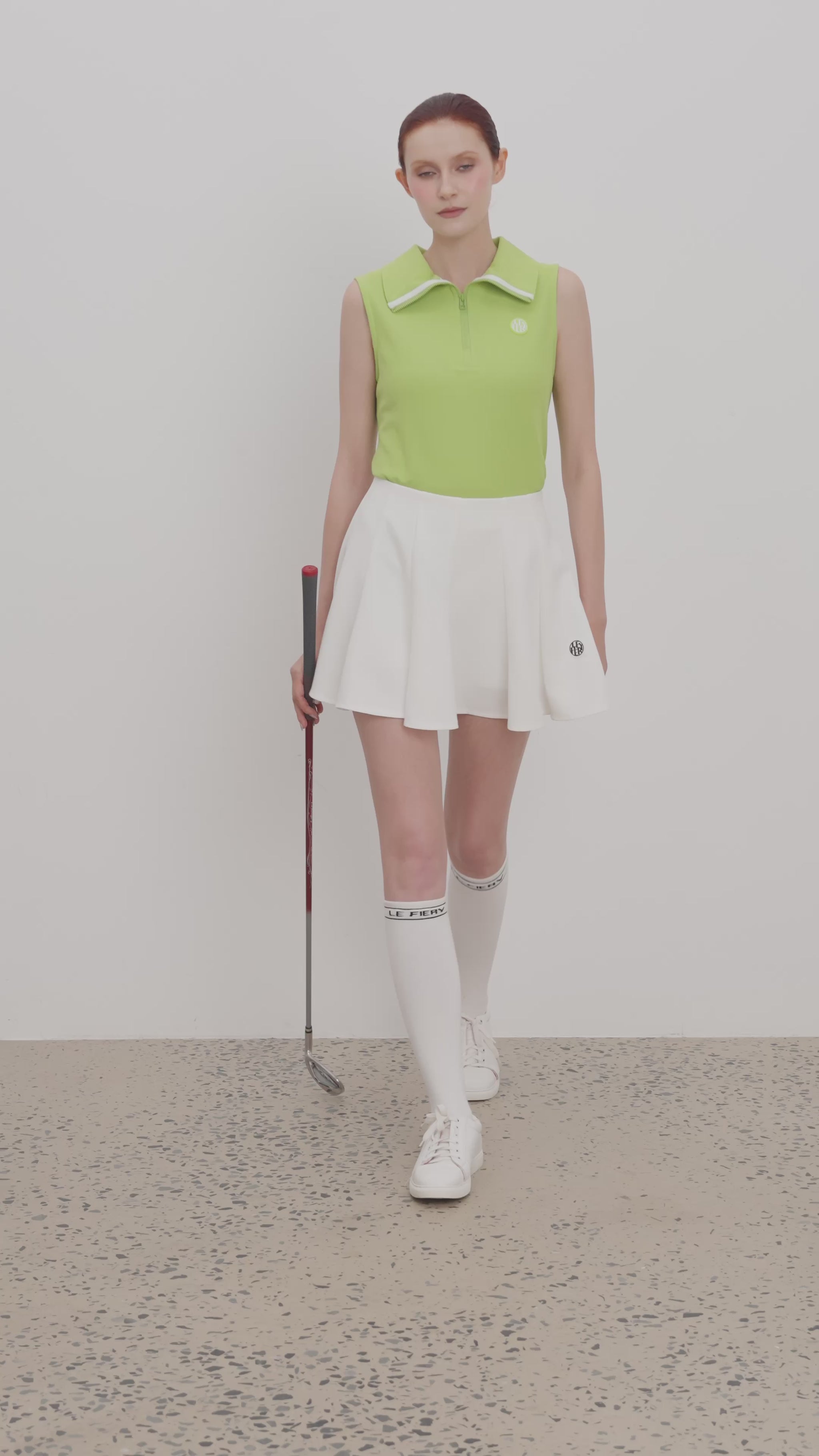 Sleeveless performance top with a structured zipper collar and fitted silhouette. Lightweight, stretchy, and breathable—perfect for tennis, golf, pickleball, or casual sporty looks. Available in Navy, Black and White.