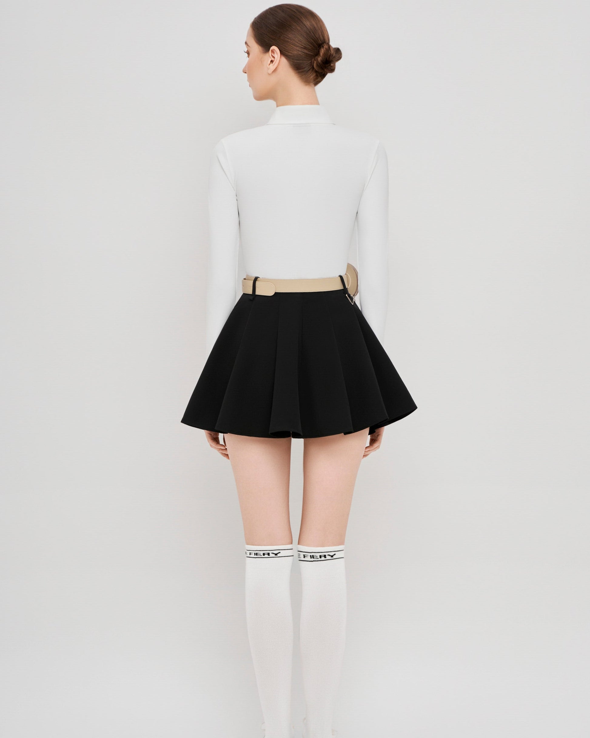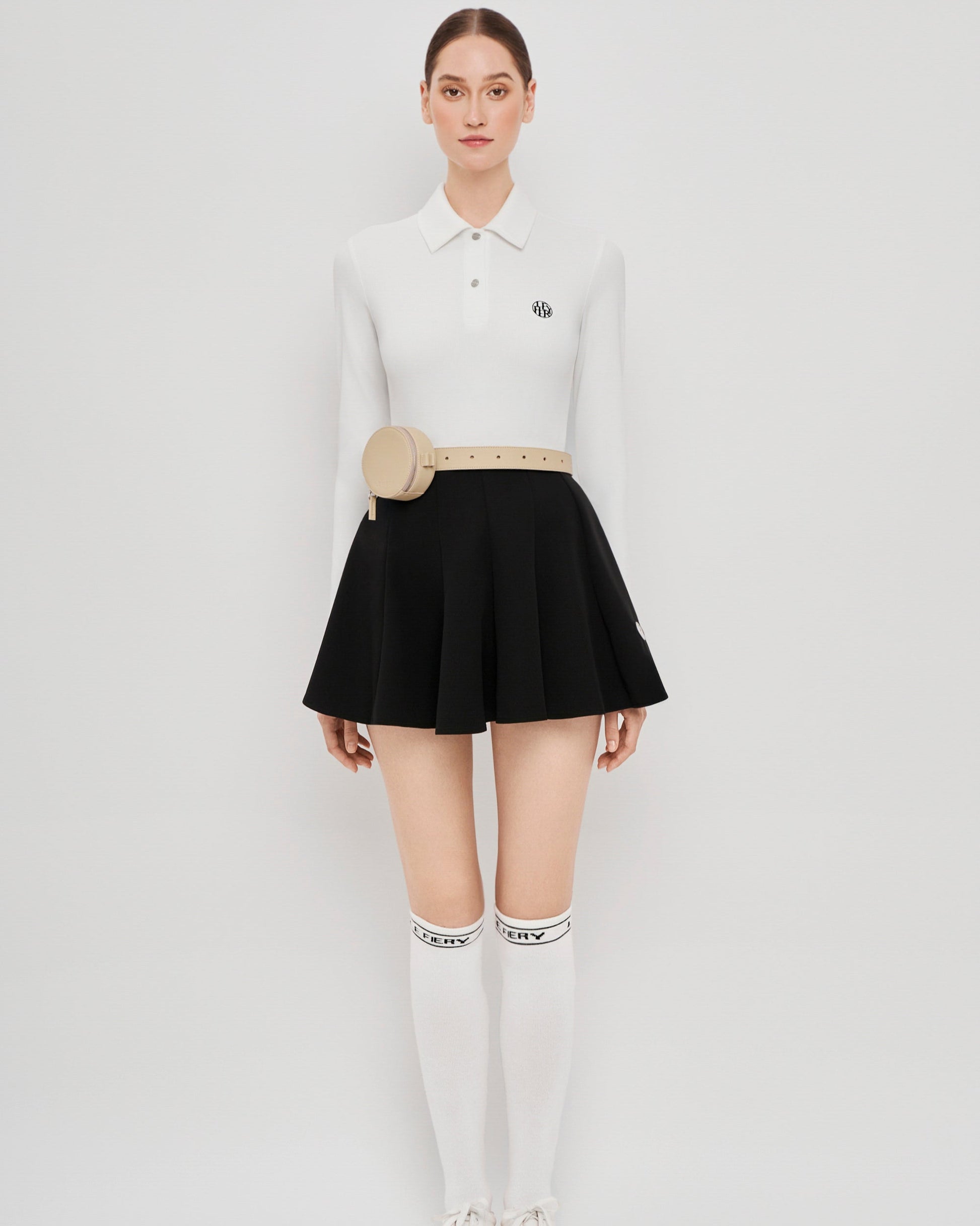 Skirt: High-waisted pleated mini skirt in dark green and navy tartan plaid. Its flared silhouette ensures unrestricted movement and a flattering fit, while the subtle logo badge adds a signature finish.