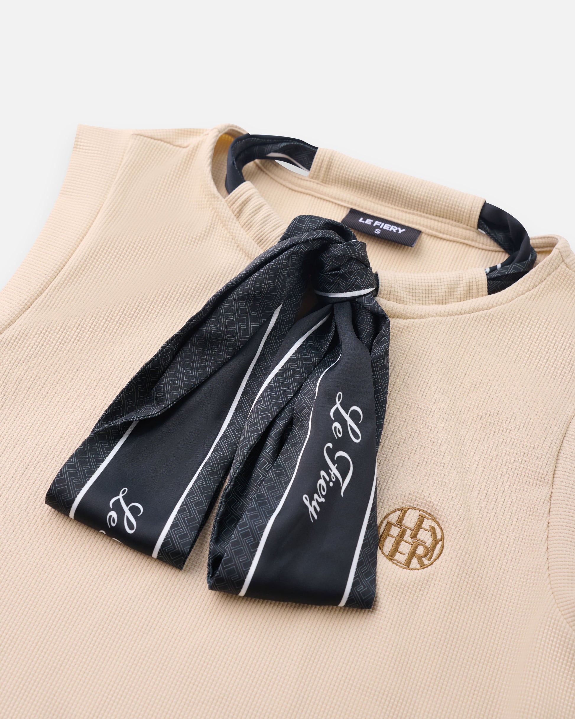 – Design: Elegant sleeveless cut, logo embroidery, contrast ribbon tie