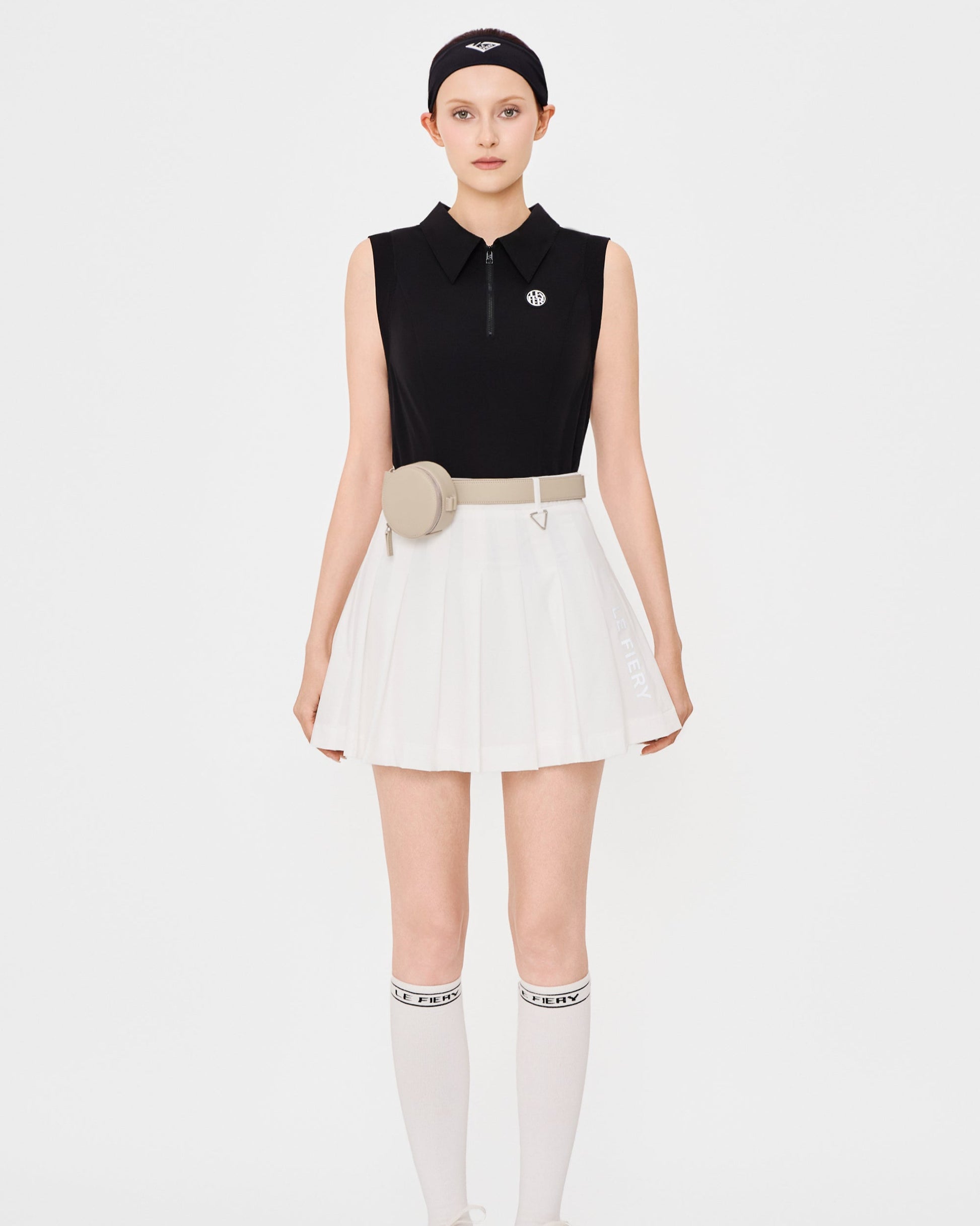 Classic sleeveless polo shirt with a front zipper collar and clean-cut design. Crafted from lightweight, stretchable fabric that provides breathability and ease of movement. A versatile piece ideal for golf, tennis, or casual sporty looks. Available in Black and White.