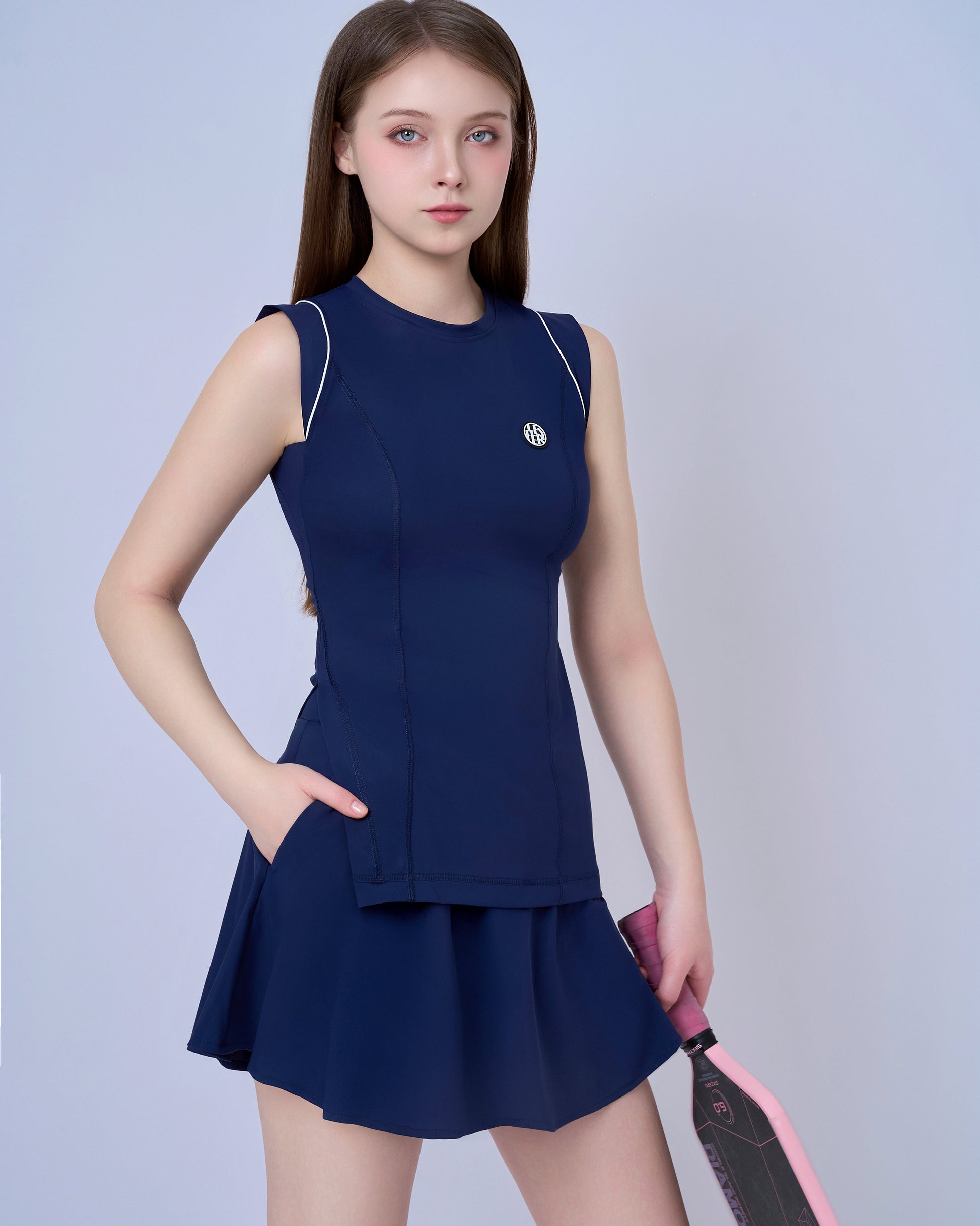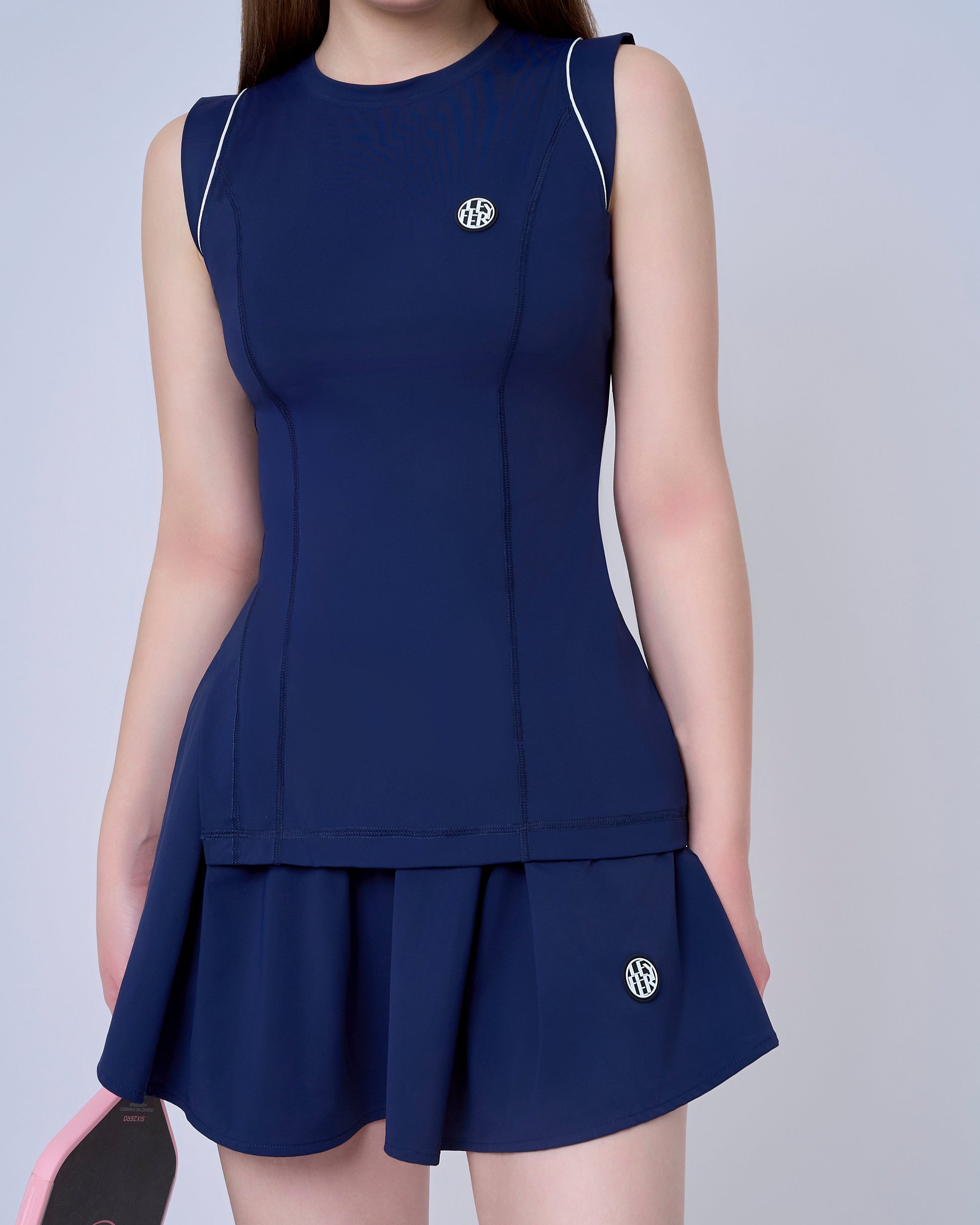 Sleeveless fitted top with a crew neckline, detailed with white piping on the shoulders for a modern athletic edge. The longer hemline adds coverage and comfort during movement, making it both flattering and functional.