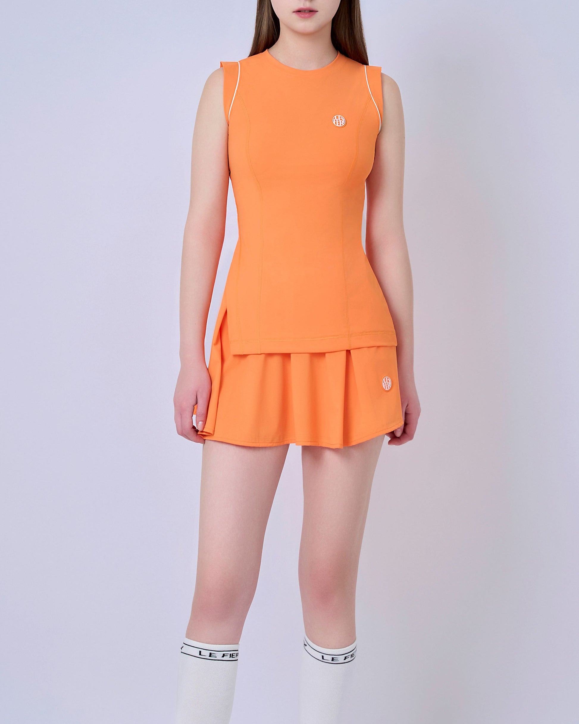 Sleeveless fitted top with a crew neckline, detailed with white piping on the shoulders for a modern athletic edge. The longer hemline adds coverage and comfort during movement, making it both flattering and functional.