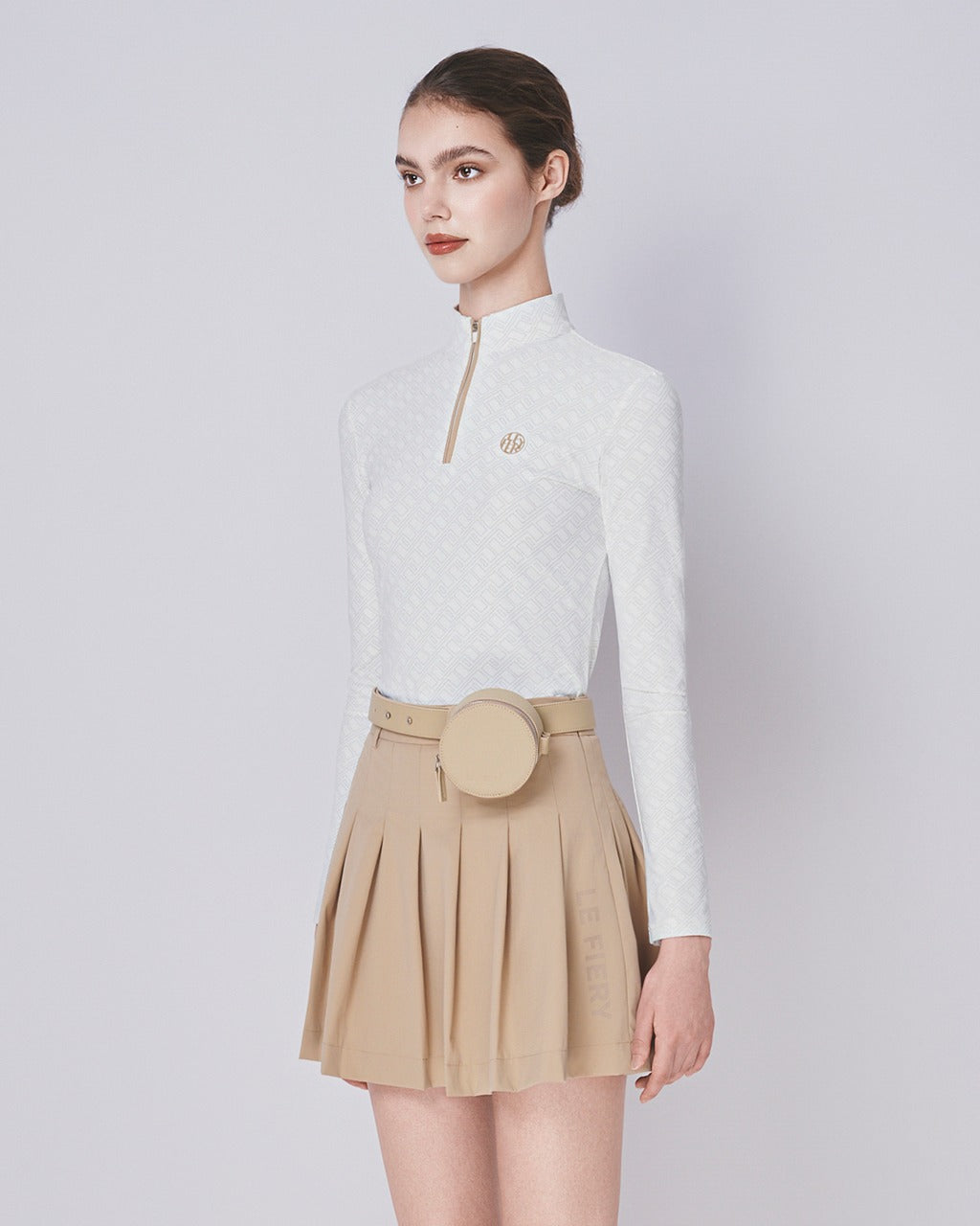 Top: Fitted long-sleeve top in soft white with subtle geometric patterns. Features a sleek front zipper and a high mock-neck collar for a clean, contemporary look. Embellished with a delicate embroidered logo on the chest.