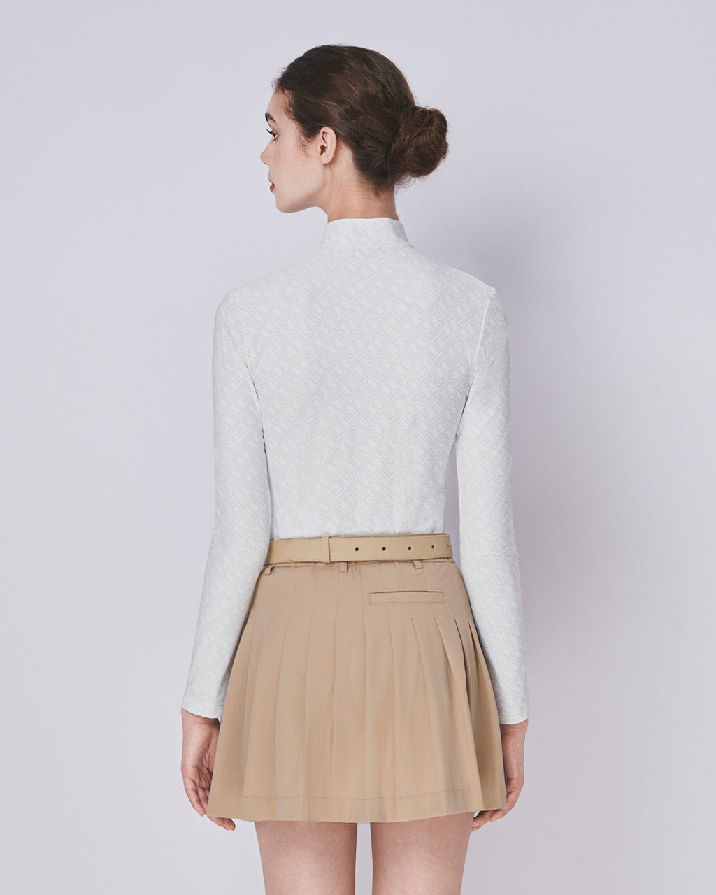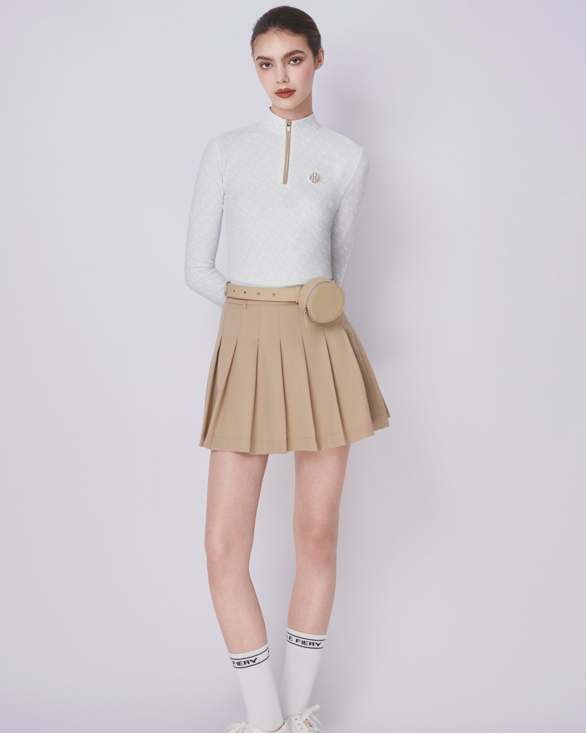 Skirt: High-waisted pleated mini skirt in a warm beige tone. A flattering A-line silhouette allows for unrestricted movement and adds a feminine touch. Finished with a tonal printed logo near the hem for added style.