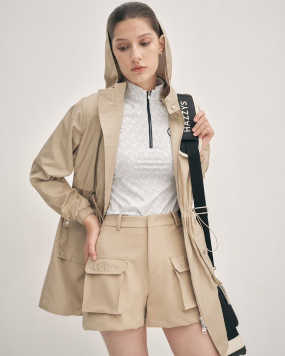 Combine performance and practicality with these stylish utility golf shorts. Featuring a high-waisted fit and structured silhouette, these shorts are designed with large flap pockets on the front for a modern, functional twist. Embroidered with subtle lettering details like "LET'S" and "GOLF", they add a playful yet refined touch to your golf wardrobe. Perfect for warm days on the course or casual sporty outings.