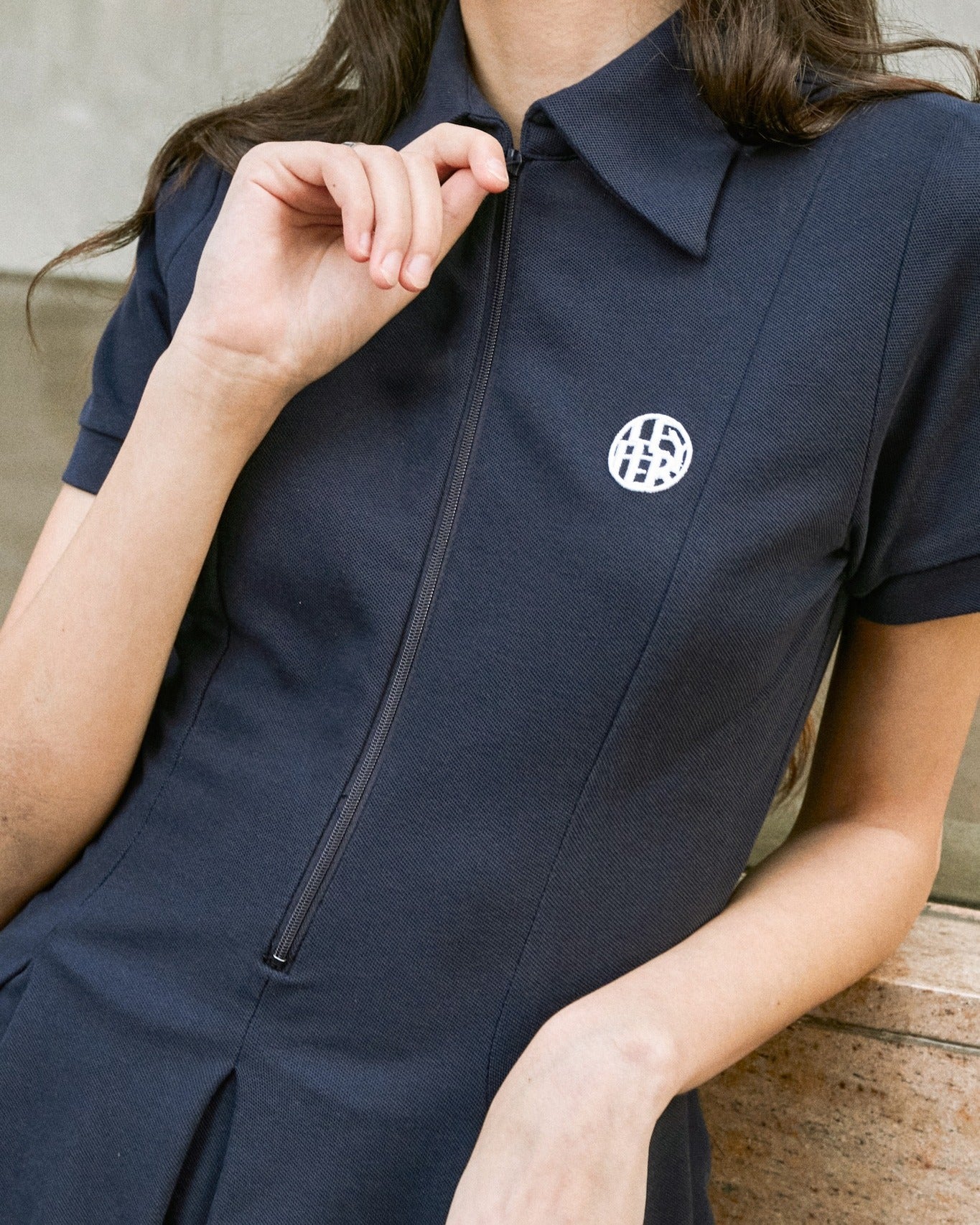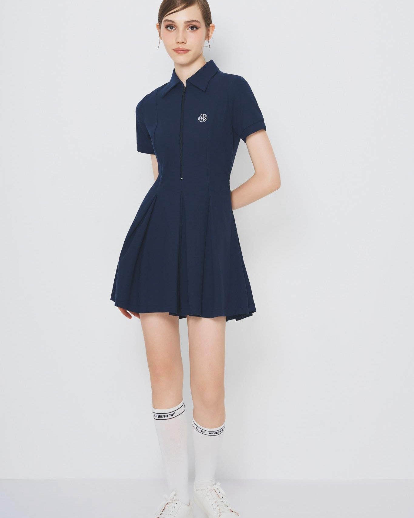 This golf dress features a minimalist yet refined design with a gently flared silhouette, offering a feminine touch and freedom of movement. It includes short sleeves, a classic shirt collar, and a front zipper for easy wear. Crafted from structured yet soft fabric that holds its shape well, it provides both comfort and style. A subtle embroidered logo on the chest adds a touch of sophistication. The elegant cream color makes it versatile for both golf outings and casual everyday wear.