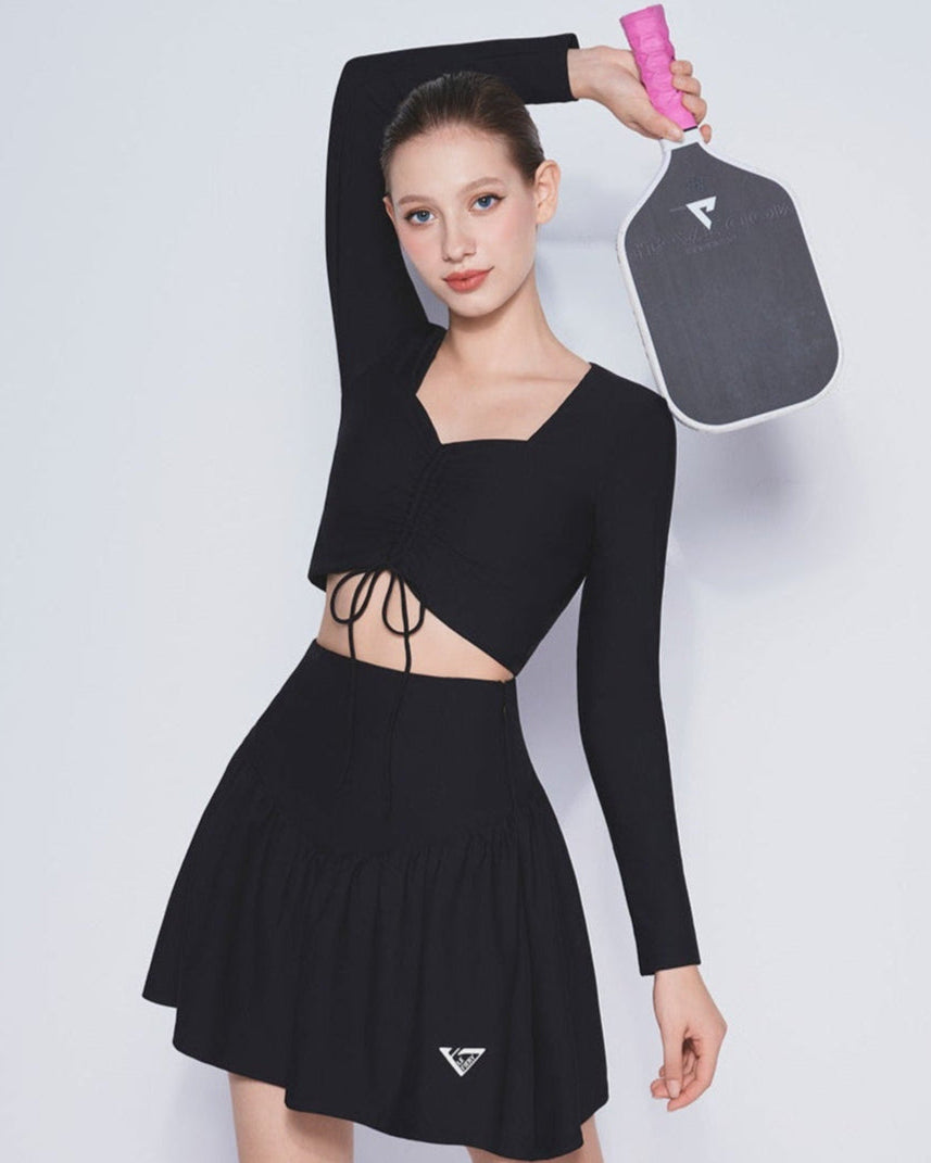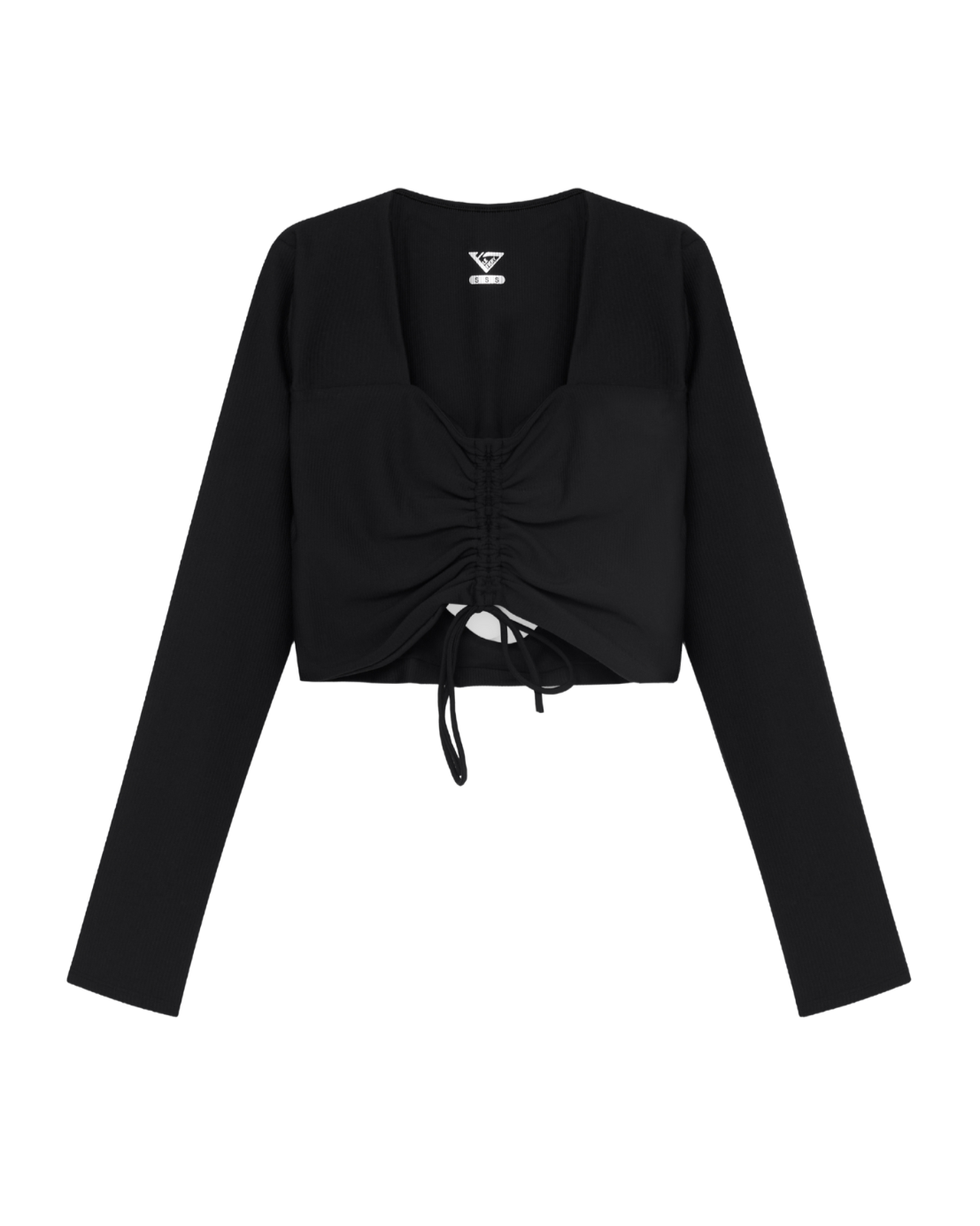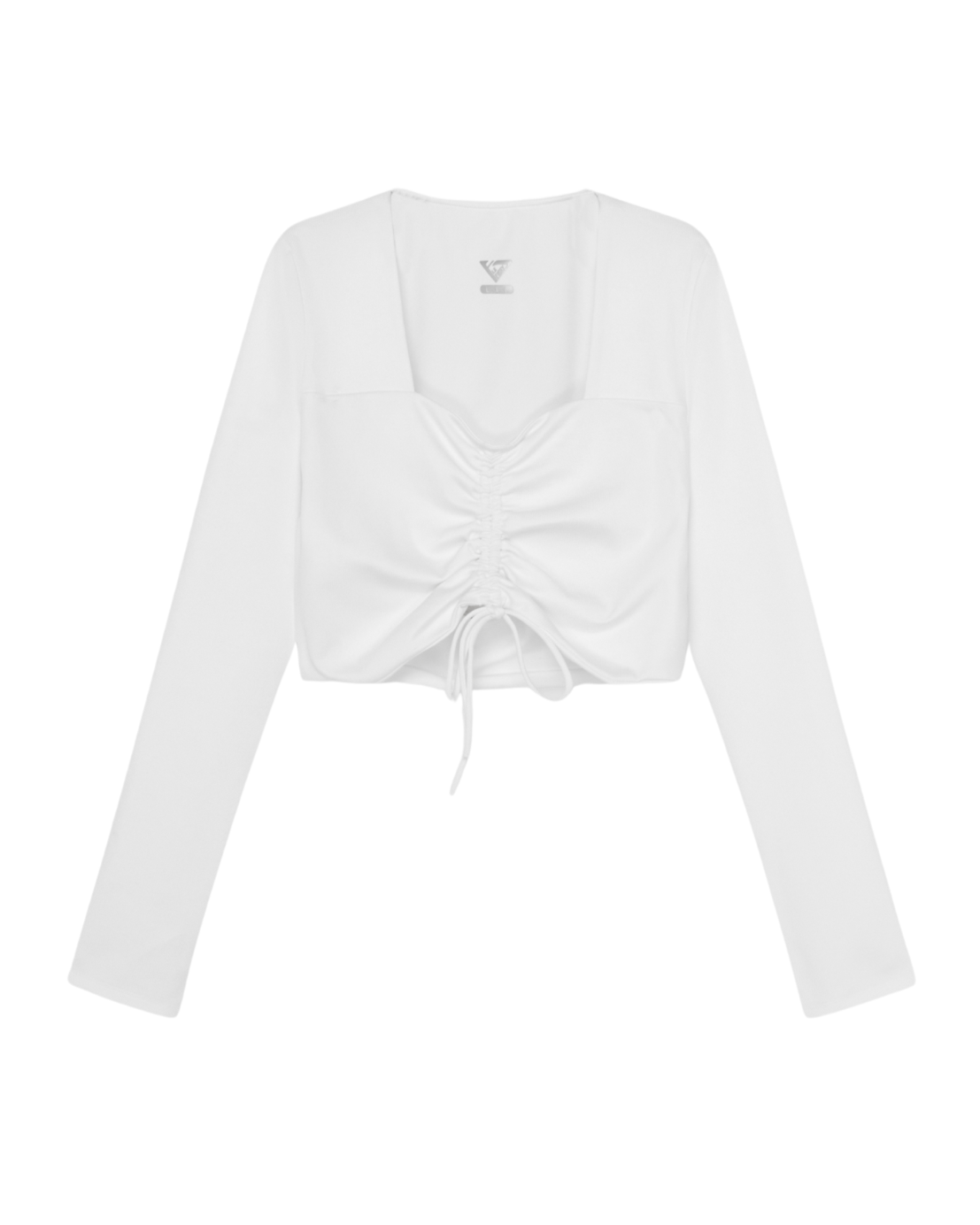 Stylish and functional long sleeve croptop featuring a square neckline and adjustable ruched front detail for a flattering fit. Stretchy and breathable fabric, perfect for layering during workouts or athleisure styling.