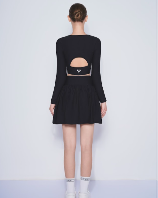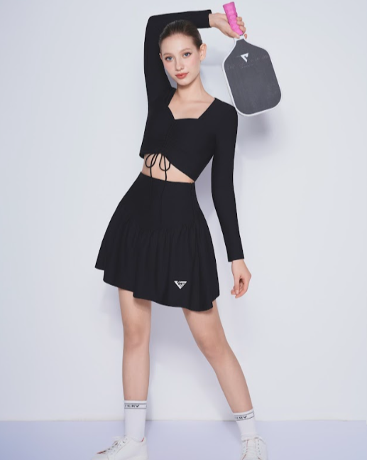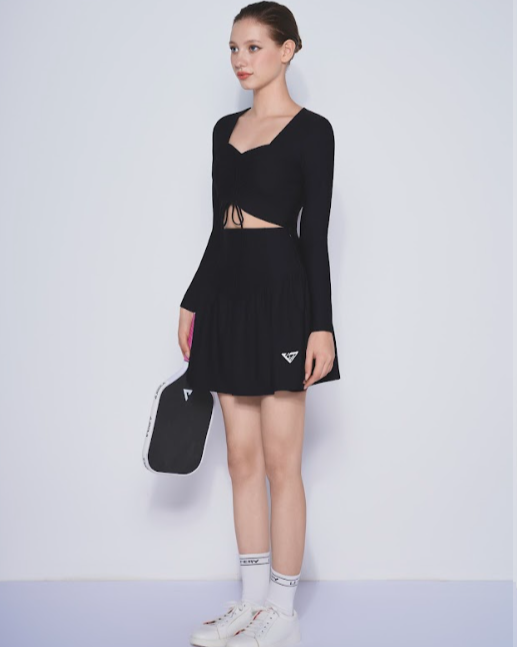 A high-waisted flared tennis skirt designed to hug the waist and create a slimming effect. Made from lightweight, stretchy fabric that ensures comfort and flexibility during movement.