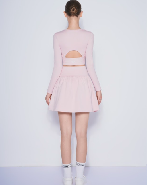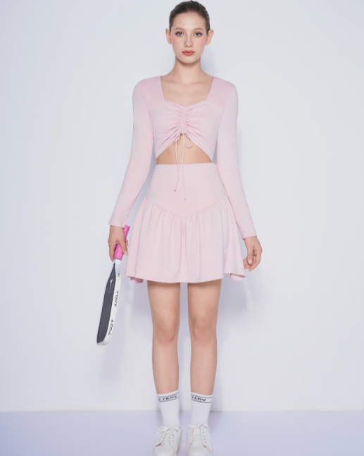 A high-waisted flared tennis skirt designed to hug the waist and create a slimming effect. Made from lightweight, stretchy fabric that ensures comfort and flexibility during movement.