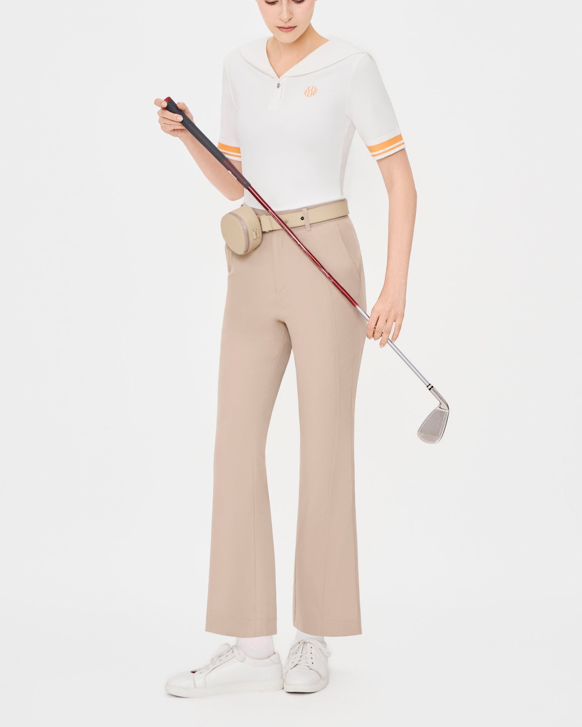 Short-sleeve polo shirt with a unique sailor-style collar and striped sleeve trim. Crafted from lightweight, stretchable fabric for comfort and ease of movement. Perfect for golf, tennis, or casual outings. Available in Orange and White.